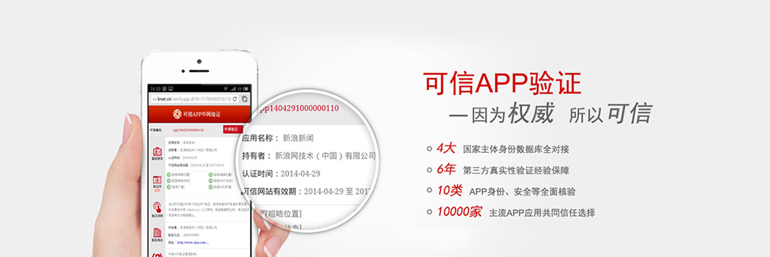 10类APP身份安全信息全面核验 100项APP综合信息交叉核验比对国家网络目录数据库、可信网站权威数据库等多家国家级权威身份档案数据库认可并收录,每家完成可信APP验证的APP将在前述多个国家级数据库中拥有唯一的编码,让你的APP与众不同。