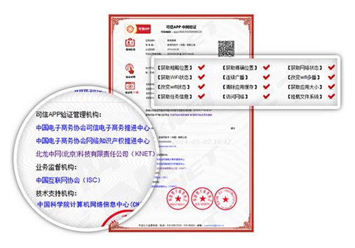 中国电子商务协会可信电子商务推进中心、中国电子商务协会网络知识产权推进中心、“可信网站”验证管理机构中网等多家权威机构共同管理,中国电子商务协会、中国互联网协会监督指导,中国科学院计算机网络信息中心技术支持,堪称国内最具权威性的第>三方APP可信验证。